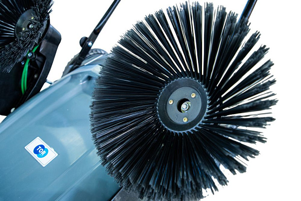 - Три щетки — две боковые убирают мусор вдоль стен и бордюров, основная щетка длиной 48 см собирает отходы в контейнер